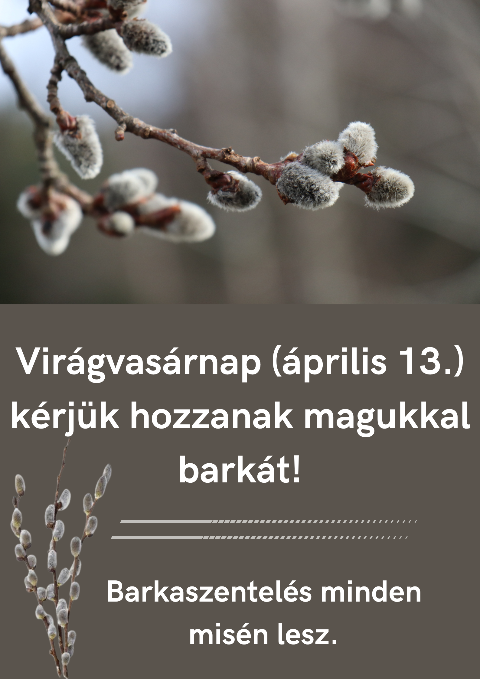 Barkaszentelést minden misén tartunk. Kérjük, hozzanak magukkal barkaágakat! A 9.00 órai szentmisére ezen kívül ünnepélyes bevonulást is tervezünk, ahol lehetőség nyílik a gyerekek számára, hogy barkaágakkal köszöntsék Jézust. Kérjük a gyerekeket, hogy virágvasárnap 8.30 órára érkezzenek meg a templom elé, hogy elpróbálhassuk a bevonulást.