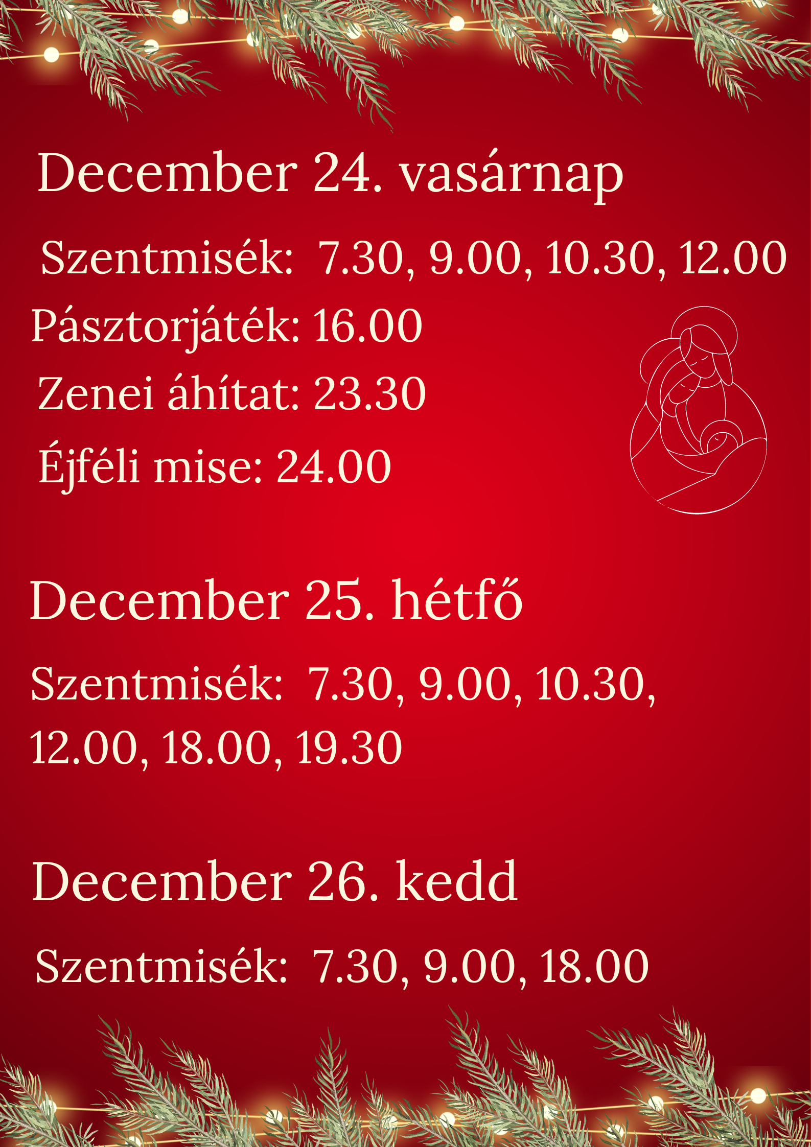 December 24-én lesz advent 4. vasárnapja. A délelőtti négy szentmisét tartjuk meg, melyek a szokott időkben, 7.30, 9.00, 10.30 és 12.00 órakor kezdődnek. Délután már kezdődik a szenteste: 16.00 órakor pásztorjátékra várjuk a családokat, majd templomunk bezár, este nem lesznek szentmisék, azonban az éjféli misére már 23.30 órától érdemes érkezni, hiszen karácsonyi zenével várjuk Híveinket és Vendégeinket. Karácsony napján, december 25-én, teljes vasárnapi miserendet tartunk.
